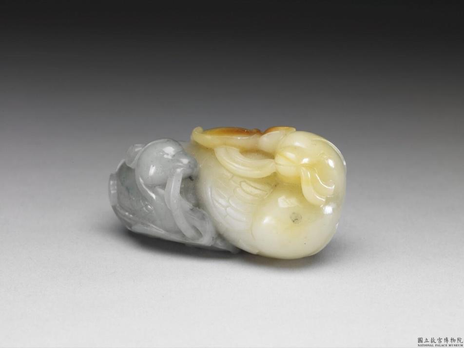 玉半边为青白色夹杂黄斑,另半边呈灰白色,夹杂黑色斑。依玉石颜色变化,分琢两相连之鸳鸯,在底部莲叶上呈俯卧姿势而互相对望。两鸳鸯口衔莲叶,叶披覆身上。