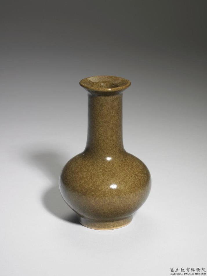 小口折唇,直长颈,硕腹,圈足,足上有长方形穿孔二。通体施茶叶末釉,光素无纹饰。底亦施茶叶末釉,中青花书「大清雍正年制」六字篆款,圈足露白胎。