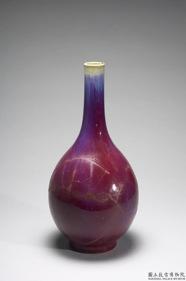 胆瓶,瓷胎,直口,长颈,斜肩,梨形圆腹,圈足。器内施白釉,器表施炉钧釉,以紫红色为主,部分窑变呈蓝色线条状,口沿薄釉处露白。足缘露胎,呈浅褐色。底部为白地模印阴文「大清乾隆年制」三行篆书款。有伤补。