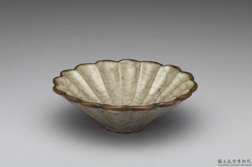 莲瓣口,深壁,短圈足,呈十六弧莲瓣形,内外各有十六道凹凸棱纹。全器施青釉,呈灰青色,釉面密布大小开片纹,口缘镶铜边,圈足内部呈十瓣莲花形。足底露胎,呈色灰褐并带铁质斑点。