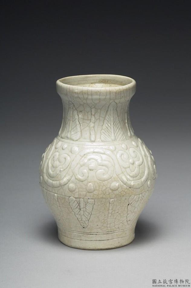 侈口,折边,宽颈,溜肩,鼓腹,圈足。全器施白釉,釉面上有浅褐色开片裂纹,以印花方式于颈部及下腹部作蕉叶纹,腹部则为波浪起伏形纹,其间加饰如意云纹及圆点,图案间以两道刻划弦纹作分隔,圈足上饰有一道弦纹。足缘露胎,胎体略有孔洞,呈白色。