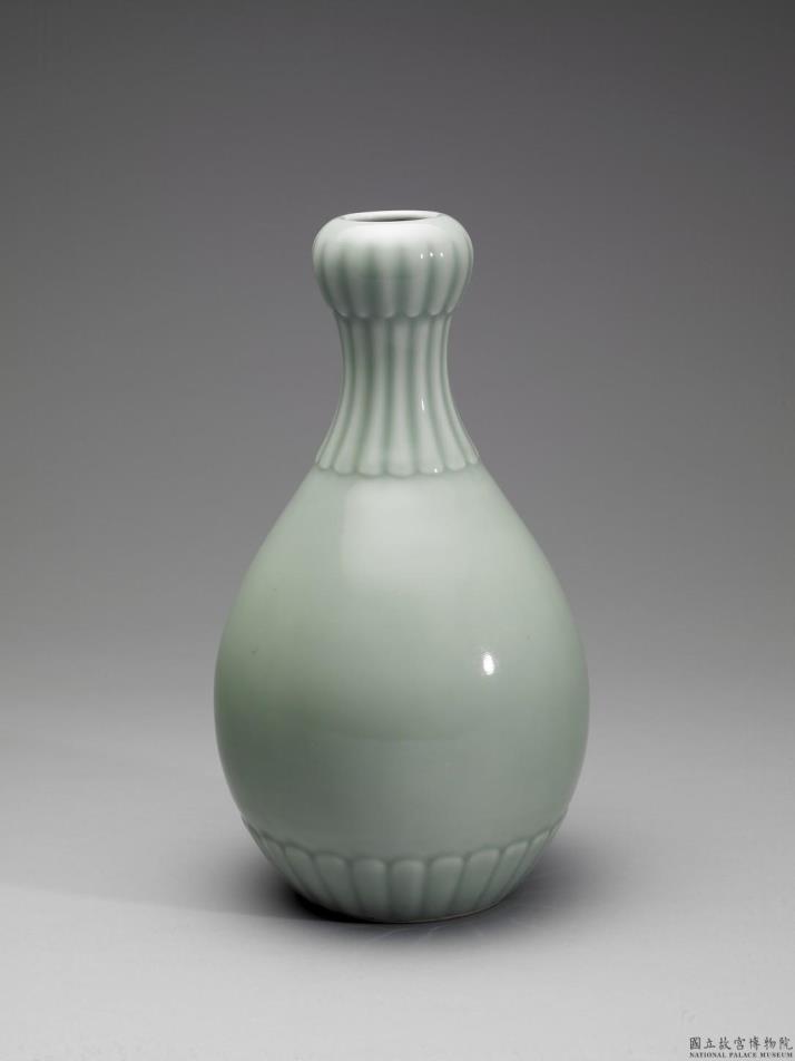 蒜头口,短颈,溜肩,敛腹,矮圈足。全器施青釉,釉层均匀,以模印方式于口、颈,腹部下缘压印莲瓣纹。圈足露胎,胎质致密呈白色。底施青釉以青花书「大清雍正年制」三行六字篆款。