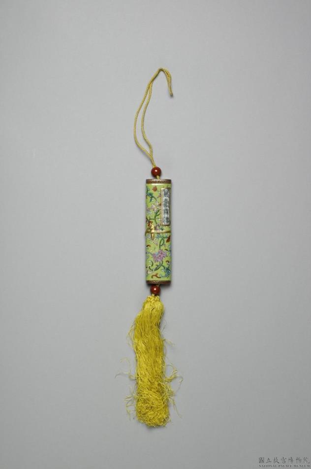 瓷牙签筒,筒作扁圆形,中空以装牙签,外壁彩绘缠枝花卉图样。一端可打开为器盖,盖上穿绳,接贯器底,出为丝穗,以固定、调整器盖的开阖。整器外型模仿已收束齐整之画卷,故器外壁中央绘有金线绕旋与金色别子,两端以红釉为地再装饰金色卷草纹一圈以示手卷之镶边。除此之外,外壁满饰草绿色底釉和缠枝番莲纹,有如一卷包首华丽的手卷。又右上有长方形金框榜题,作黑色「万寿无疆」四篆字,由此推测此器或是为祝寿而制作之物。