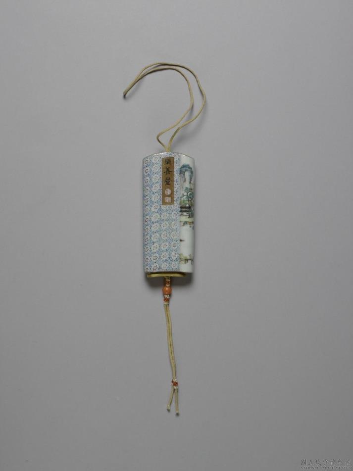 牙签筒为私人用器,在上面题句写诗,仿佛加盖戳记以强调其私属性。此器作扁长方形,分内外两筒,内筒扁平、中空以装牙签,外筒状若画卷,当作器盖来使用。两筒之间并贯以丝绳,不用时两筒可互套以便于收藏及携带。 即使小巧若此的作品,依然流露出一个「萃工逞能」的时代风格。所以外筒一面彩画锦纹,制造仿如画卷的包首,并以墨书题出「乐善堂」,而标题之下有朱红描绘的「干」、「隆」二印。另一面彩画青绿山水。至于内筒,一面墨书御题诗,诗句之下以朱红描绘「御」、「制」二印,另一面以朱红将御题诗分绘成各式的印章。乾隆皇帝喜作诗,二十岁出版《乐善堂诗文集》,集中收录者皆为登基之前的旧作。或许因为皇帝曾经亲自交出诗稿,要督陶官唐英将之安置于轿瓶器表,故御窑厂为讨圣上的欢心,遂连乐善堂诗文亦当作高尚文雅的图饰,将之放在瓷器上。不过皇帝对于瓷器上应该出现何种诗作颇有自己的想法,他本人以为乐善堂诗不宜烧在器表,故于乾隆十七年(1752),亲自交下御制诗四套,并告知唐英:「嗣后烧造瓷器,应用诗之处即用此诗捡选烧造,不必用乐善堂诗文」。由此可知,乾隆皇帝的确透过类似安放诗文的作法,来表达他关心官窑的烧造与生产。