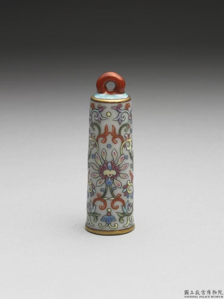 翎管,插饰羽翎的管状饰物。平顶,直筒形,器身上小下大,中空,无底,以插翎其中;顶端带环形系,使与帽相衔。管身饰白地粉彩缠枝花卉,上下缘饰金边。器里作浅蓝色。