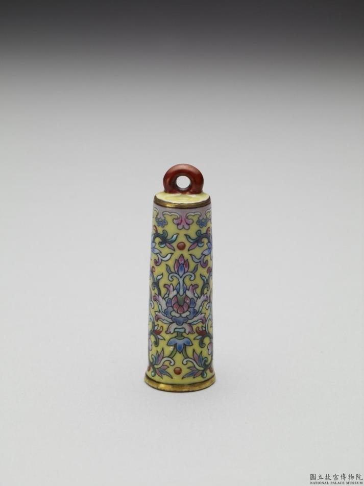 翎管是清代宫廷官员冠帽上的饰物。平顶,直筒形,器身上小下大,中空,无底,以插翎其中;顶端带环形系,使与帽相衔。黄地的管身装饰着以黑边钩勒出轮廓线的番莲花、莲花及卷草纹;并填以各色彩料。上下缘饰金边,器里作浅蓝色。