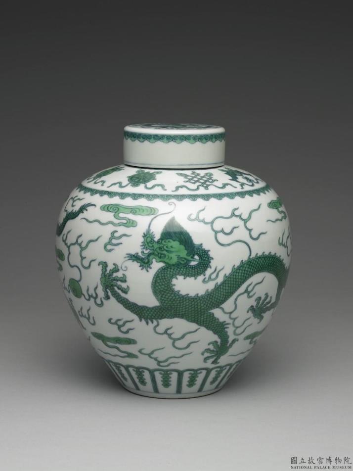 敛口,短颈,丰肩,硕腹下部敛收,凹足,带平顶盖一。盖及壶身皆由青花勾画纹饰之轮廓线、再填彩,一般称之为「斗彩」。在壶腹两侧各画一行龙,龙身成波曲状爬行于云纹之间,在青花轮廓线内填以绿釉彩,在龙的周间画火焰纹及朵云纹,罐肩饰一圈佛教八吉祥及如意云纹边饰,腹下为莲瓣纹饰,盖面宽平,绘有一龙及火珠纹,隙地间饰火焰纹,盖缘边点以如意云纹。底以青花书「大清乾隆年制」六字三行篆款。