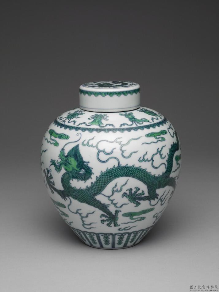 敛口,短颈,丰肩,硕腹下部敛收,凹足,带平顶盖一。盖及壶身皆由青花勾画纹饰之轮廓线、再填彩,一般称之为「斗彩」。在壶腹两侧各画一行龙,龙身成波曲状爬行于云纹之间,在青花轮廓线内填以绿釉彩,在龙的周间画火焰纹及朵云纹,罐肩饰一圈佛教八吉祥及如意云纹边饰,腹下为莲瓣纹饰,盖面宽平,绘有一龙及火珠纹,隙地间饰火焰纹,盖缘边点以如意云纹。底以青花书「大清乾隆年制」六字三行篆款。