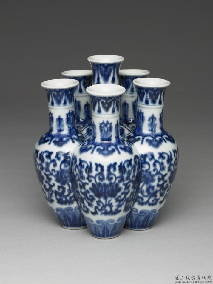 以中央主瓶为中心,五个撇口长颈瓶圈围连接而成一六连瓶。除了中间一个颈部较长外,六个瓶子肩部及底部高度齐平,瓶身高度相同。外围的五个相连瓶壁内部相通无隔,中间主瓶则由肩部至底部钻数个洞孔与外连之五瓶相通。器表满绘发色鲜艳但图案漫漶不清的青花纹饰,颈部为缨络纹及折枝变形花卉纹,肩部饰一圈如意勾连缨络纹,瓶身为缠枝宝相花纹,近底部处并有一圈发色较浅的变形蕉叶纹。器底圈足内皆上透明釉,中央瓶底内有「大清乾隆年制」三行六字款。
