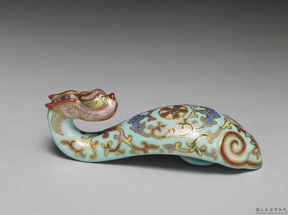 琵琶形,钩首为弯曲的龙头状,背面设圆钮。带钩是古人扣接腰带,或配挂镜囊、印章、刀鞘、钱币或玉佩等饰品的服饰用具。龙首为粉色彩地,以金线勾勒龙首及鬃毛,龙鼻及龙角涂绘鲜艳的红色,龙眼以泥金描绘,整体线条流畅,雍容贵气。器身以绿彩为地,和龙首相同以金彩勾勒器身纹饰。纹饰分内外两圈,外圈以龙颈的四瓣花纹为首,向下连接卷草纹,近底处以金线勾框,内填红色如意为饰,其中以番莲纹为主花,花蕊凸出连接一朵四瓣花。内圈以描金蓝彩双蝠和寿桃为边饰,中间饰一朵团花卉。