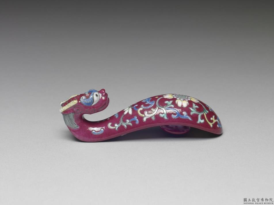 琵琶形,钩首为弯曲的龙头状,背面设圆钮。带钩是古人扣接腰带,或配挂镜囊、印章、刀鞘、钱币或玉佩等饰品的服饰用具。整器以红彩为地,龙角及鬃毛顺着带钩形状描绘,一体成形。器腹饰团寿花卉纹,上承蓝色蝙蝠及白莲,其侧以卷草纹勾勒绘制而成。