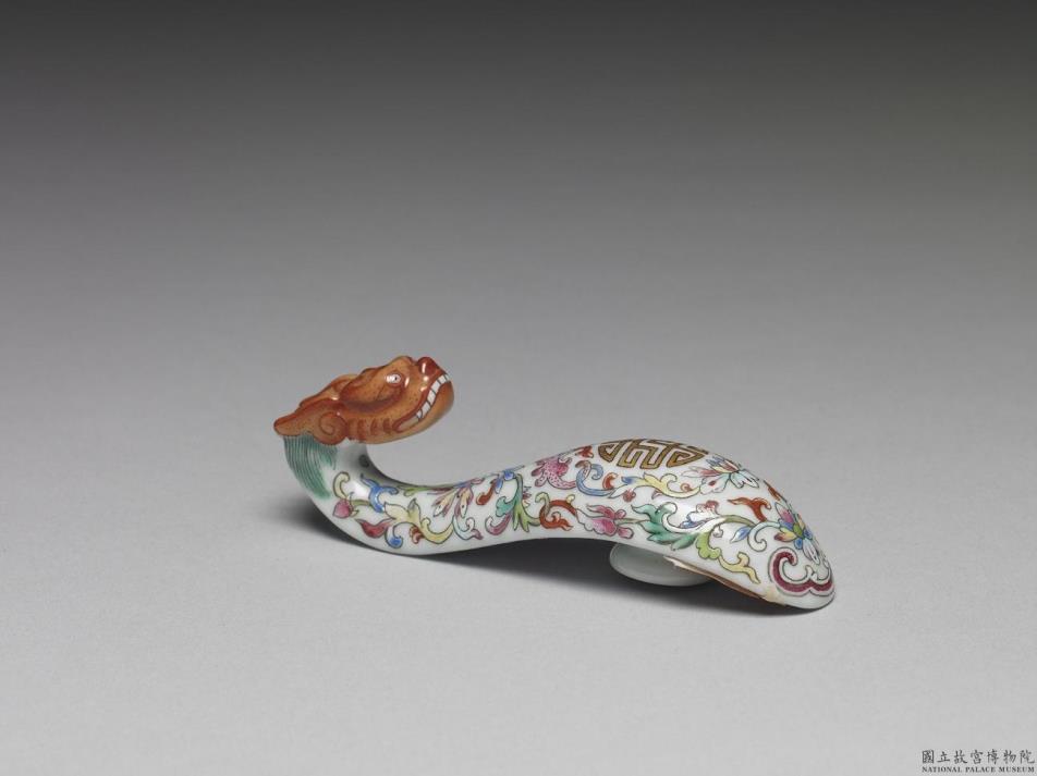 瓷制带钩,钩首作一回首龙头,钩身微拱呈S形,底部带一圆钮。全器以白釉为地,龙首薄施红釉并点染红斑。全器以黑线描绘龙首五官与钩身各式花纹。钩身表面于中央绘饰金色团寿字,上方带一红色蝙蝠,下方为一如意云纹,隙地饰满卷曲花叶纹。带钩底部有六个支烧痕,并饰以金彩朵花。全器用色鲜艳夺目,纹饰描绘细腻而工整。