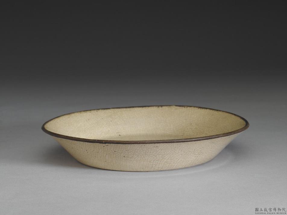 侈口,口缘镶铜扣,深壁下敛,平底。整器施透明釉,器表有细密的开片,并呈现白中泛黄的色调。外壁光素无纹,内底心釉下划花龙纹为饰。底外满釉无款,见有明显的旋削痕。