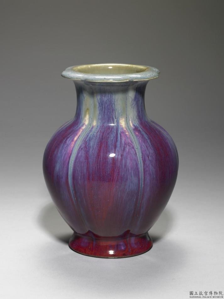 圆口折沿,折沿作六瓣花形,短直颈,硕腹下敛,撇足。通体施钧红釉,呈红、靛、紫、月白等多色深浅混杂流动窑变釉,口内与折沿则多作浅月白蓝色。器底施酱釉,底心印「大清乾隆年制」六字三行篆款,圈足露胎,涂赭色汁。仿钧窑变釉为雍正时出现的新品种,系仿钧釉色繁衍而来,采多次施釉,烧成过程中,不同金属元素自然结合。所产生的流动窑变釉色,一般偏红者,称「火焰红」。