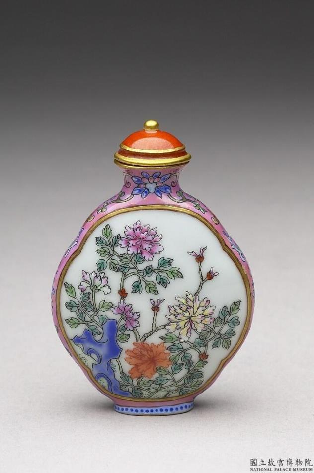 瓷质。圆口短颈,扁腹椭圆形足,前后壁成四瓣椭圆形,两侧微拱,壁一面绘菊花由石间生出,花朵姿态各异,色彩动人。器壁另一面则写饰隶书乾隆御制诗。隙地绘饰粉红地彩连枝花卉纹,底有「乾隆年制」四字篆款。有红色圆顶盖。本器一式二十件,共储于一木匣。
