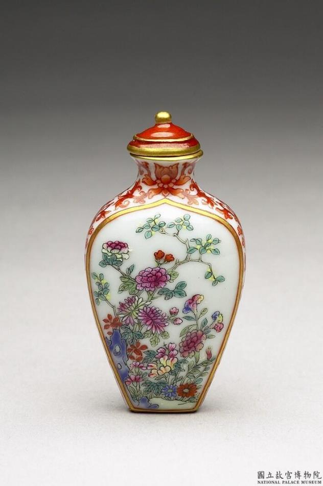 扁圆形小瓶,平口,短颈微敛,硕腹,平底。腹两面有绘金线开光,内彩绘湖石与各种花卉,双面同纹,其余饰橙红色变形莲纹。器底横书「嘉庆年制」篆款。有红釉地描金线带钮瓷盖,附牙匙。本器一式十件,共储于一木匣。