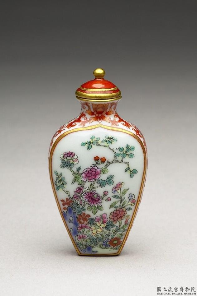 扁圆形小瓶,平口,短颈微敛,硕腹,平底。腹两面有绘金线开光,内彩绘湖石与各种花卉,双面同纹,其余饰橙红色变形莲纹。器底横书「嘉庆年制」篆款。有红釉地描金线带钮瓷盖,附牙匙。本器一式十件,共储于一木匣。
