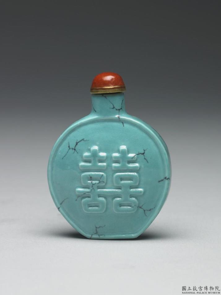 扁圆形小瓶,平口,短颈,硕腹,平底。全器施松绿釉,有灰黑色纹线,腹略内挖,锥拱「囍」字。带红釉描金小瓷盖与牙匙。本器一式十件,共储于一木匣。