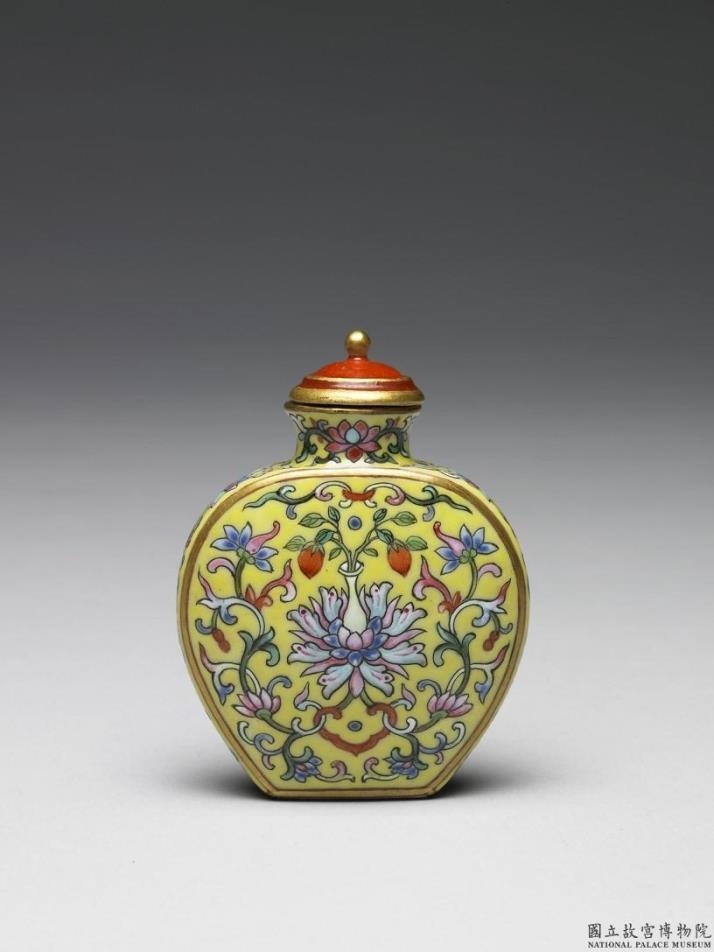 鼻烟壶,口外撇,短颈,扁圆腹下敛,上厚下薄,前后微鼓,平底,附红色盖,盖上突起小钮,下接木塞、牙匙,用来舀壶里的鼻烟,或盛在小碟上,或直接放在拇指背上,入鼻嗅用。全器满布黄地彩绘卷枝花纹,花心伸出桃实,花心伸出桃实;盖沿、口沿及器缘均描金边。底外有一行四字篆款「嘉庆年制」。乾隆、嘉庆年间,常成套烧制釉上彩鼻烟壶,此器为一套十件的其中一件。