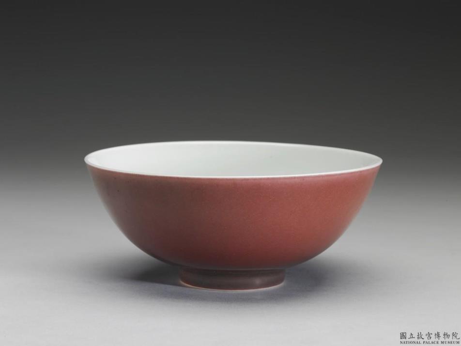 侈口大碗,深壁,平底,圈足。外壁罩铜红釉,釉色均匀。器内及外底施透明釉,圈足底缘露胎一圈。底书青花双圈「大清雍正年制」双行楷款。