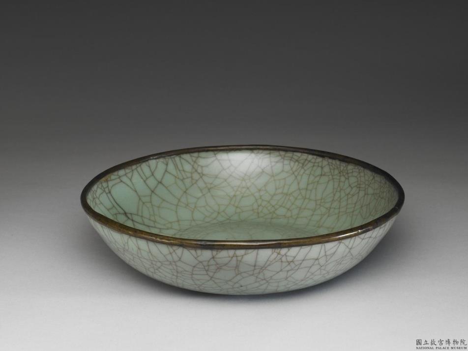 圆侈口,加嵌铜边,平底卧足,胎骨较厚。内底面微鼓起,垫烧,施青釉。釉调不匀,外底颜色较淡,其余青绿,局部泛灰。器表满布棕色纹片,外底垫圈周缘沾黏一截窑具,足缘有多层施釉痕,足端露出黑灰色的胎体。
