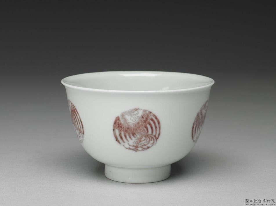 小杯,圆口,唇缘外侈,弧形深壁,平底,矮圈足。胎骨甚薄。外壁装饰五个红釉团凤纹,内底中心亦绘一团凤纹,凤首与躯体成S型,双翅展开于两侧,使整个图案成圆形,红釉发色呈浅红色,带绿色苔点。外底中心以青花书「大清康熙年制」双行六字楷款,外加双圈。