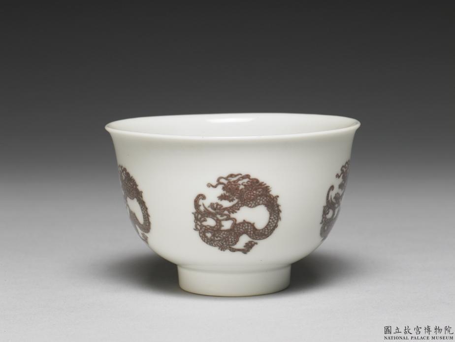 小杯,圆口,唇缘外侈,弧形深壁,平底,矮圈足。胎骨甚薄。外壁装饰五个红釉团龙纹,内底中心亦绘一团龙纹,龙盘身张爪成圆形,红釉发色呈暗红色。外底中心以青花书「大清康熙年制」双行六字楷款,外加双圈。
