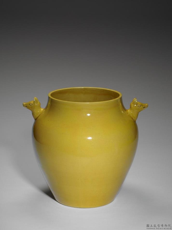 敞口罐,腹部上广下削,平底浅凹,全器光素,仅肩上双耳小兽形,器内外满覆黄釉,底外有「大清乾隆年制」三行六字篆款,故知为此器为清代乾隆朝之制作。由于乾隆朝成书的《皇朝礼器图式》卷一之中,其〈社稷坛正位尊〉、〈地坛正位尊〉与本器相类,且明言其为瓷质、黄色,故知本器为乾隆朝所使用的祭器。存世亦见有施红釉、白釉者,亦可经由《皇朝礼器图式》的载录,得知其对应使用的祭祀场合。此外,明代弘治朝亦有类似器存世。