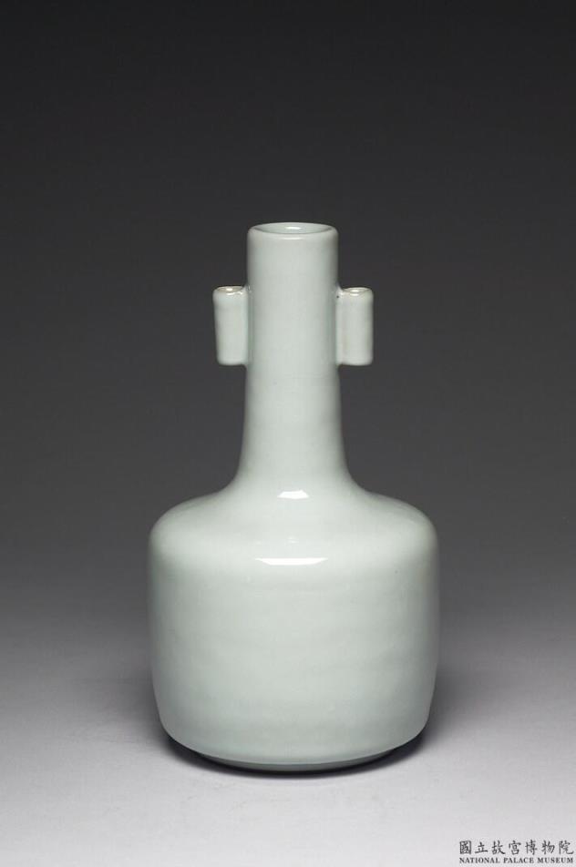 圆口,长颈,折肩,圆腹,矮圈足,双贯耳。通体施汝釉,色淡青莹润,光素无纹。圈足露胎,涂赭色汁,底心青花书「大清乾隆年制」三行六字篆款。