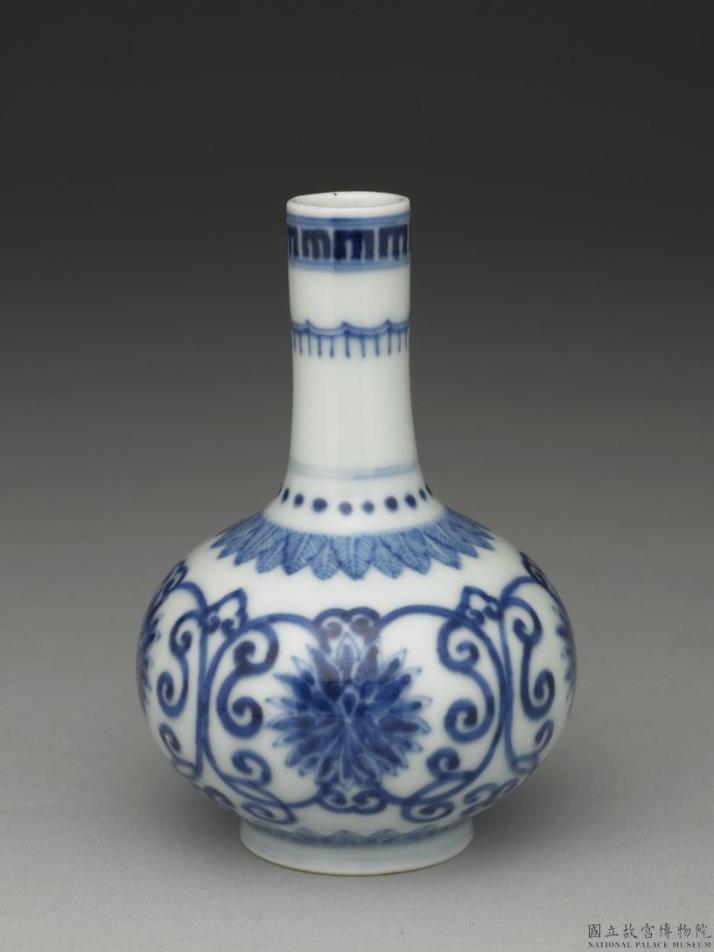 直口,长颈,圆腹,圈足。外壁以青花为饰,口沿绘几何纹一圈,颈中有两道波浪纹,下垂直线纹,如流苏一般;颈下缘绘点纹一圈,腹部中央以如意云纹围成四开光,开光内各绘一朵番莲纹,上下各绘蕉叶纹一圈。足底缘露胎,呈白色,底以青花书「大清雍正年制」双行六字楷款,外加双圈。