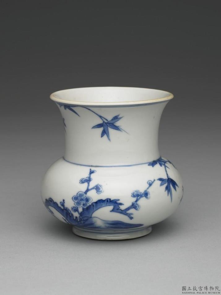 侈口外敞,长颈,扁圆腹,矮圈足。全器内、外壁通体罩施白釉至足际,足圈露胎。全器青花色泽浓淡有致,器颈饰竹叶,腹壁饰枝干纠结曲张之梅树与修长挺拔之竹丛。底有「大清年制」青花楷书款。