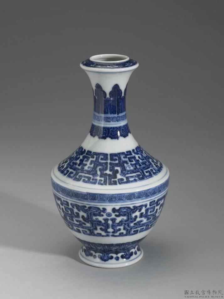 青花瓶,盘口、短颈、折肩、硕腹下敛、撇足。器身白地,绘青花纹样。口缘绘如意云头纹一周,颈部绘蕉叶纹、回纹与变形莲瓣纹。肩部绘二龙纹,两两相视,二口中间有一圆珠,下缘饰一弦纹;腹部亦绘二龙纹,两两相视,二口中间有一圆珠,腹部上缘饰回文一周,底边绘莲瓣纹;足部绘如意云头纹一周,并饰弦纹一道。如意云头纹、莲瓣纹和龙纹均采勾边留白技法描绘而成。器底圈足露胎,圈足内施白釉,有青花书「大清乾隆年制」三行六字篆款。