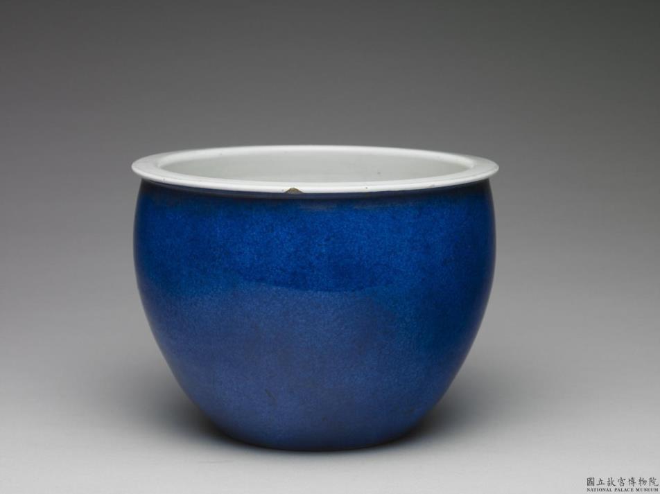 鱼缸,直口,口沿平出,深壁,上丰下敛,内凹成足。口沿及内壁施白釉,器壁施霁青釉,略有积釉处,形成深蓝色斑点;底内中央拱有一朵十二瓣花,有棕眼。足内施白釉,足内外底露胎呈褐色,有辘轳痕。