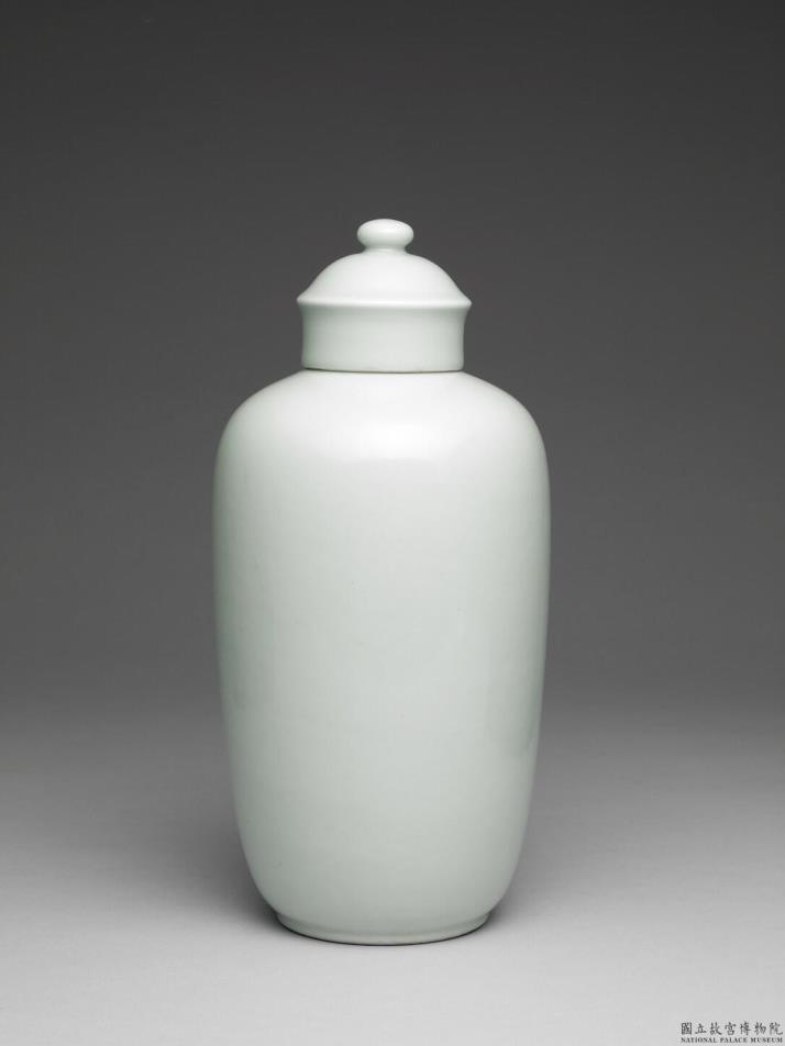 小圆口,束颈,丰肩,深壁直下,器身呈圆筒状,圈足,带圆钮盖。通体均施仿汝釉,呈粉青色,釉色匀净淡雅,胎骨匀细。底青花书「大清雍正年制」六字双行双圆框楷款。