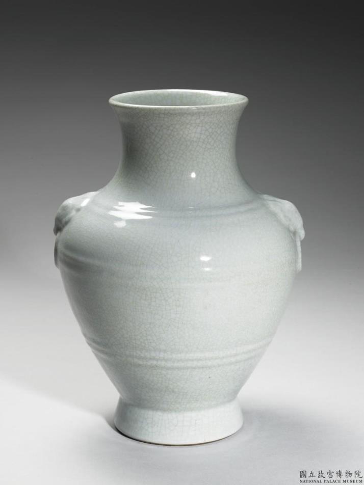 侈口短颈,丰肩下敛,撇足,器肩两侧贴饰兽首衔环暗耳。颈肩交界处双弦纹一周,腹外壁等距双弦纹两圈,全器罩施青釉,色泽仿自北宋汝窑,釉质凝润并有细碎开片,釉薄处略见胎色。圈足露胎褐色汁,足内亦施青釉,书青花「大清雍正年制」三行六字篆款。