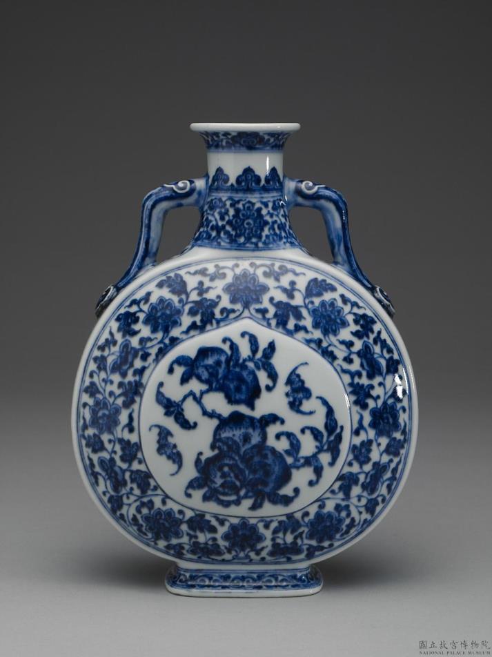 扁壶,唇口外撇,短直颈,扁圆腹,两侧如意耳连接颈肩,方足外撇。整器以青花绘饰卷枝花、如意云头、缠枝番莲花。腹外壁中央微凸,饰桃形开光,内绘折枝桃实与蝙蝠,带有「福寿」的吉祥寓意。开光外满饰缠枝番莲花,足墙饰卷草。钴蓝釉料凝滞成块,并刻意点蓝斑,营造铁锈斑的样貌,这种效果应是想追仿明永乐、宣德时期青花釉料特色。底足露胎一圈,足内白釉地青花书「大清乾隆年制」三行六字篆款。
