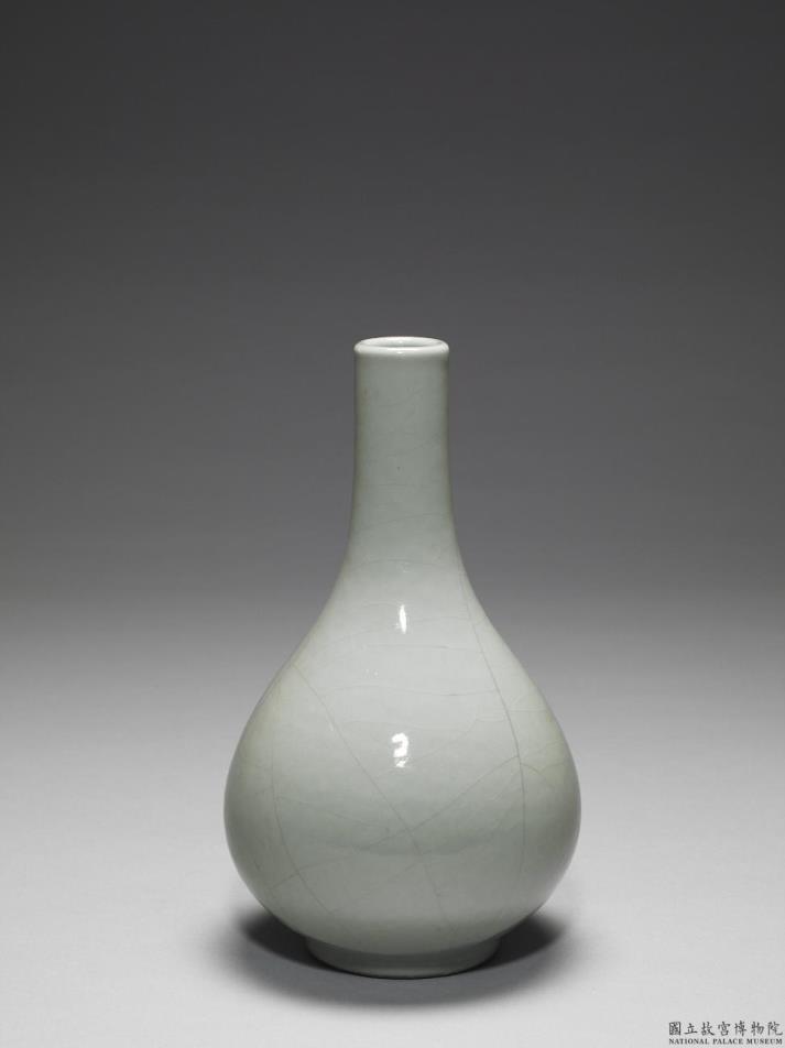 直口,长颈,斜肩,垂腹,矮圈足。全器内、外壁罩施白灰色釉至足际。周身带有少许开片。足圈露胎并施护胎釉。足内青釉地书「大清雍正年制」三行六字青花篆款。