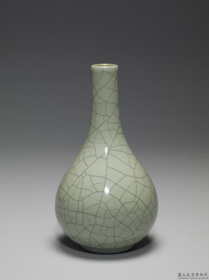直口,长颈,斜肩,垂腹,矮圈足。全器内、外壁罩施白灰色釉至足际,周身布满铁灰色开片。足圈露胎并施护胎釉。足内青釉地书「大清雍正年制」三行六字青花篆款。