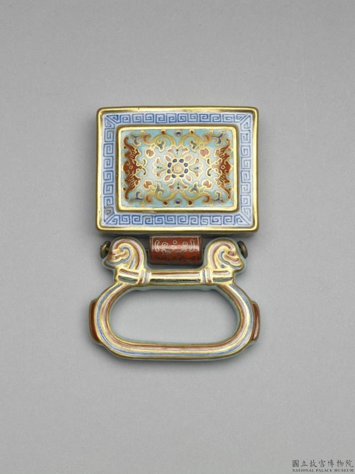 四方形瓷带板,一面边框棱起,复面上亦棱起一四方形框,棱起处皆涂饰金彩,双棱间填饰白地蓝彩回纹。方框内带面鼓起,湖绿地多彩釉绘饰图样,中央一朵缠枝番莲盛开,番莲两侧各绘红色蝙蝠一只。带板另面内凹,上有两长条形瓷带平行架跨该面,瓷带上见有支钉痕。瓷带板侧边饰卷枝番莲花叶,其中一侧带中空瓷管,管外壁红地金彩绘饰草叶。金属长螺帽穿亘瓷管,接连、固定一近椭圆形瓷环。瓷环满饰湖绿釉,面上以红色、金色、蓝色绘饰,使瓷环有如多色丝绳绑袱、曲为椭圆之貌。这些装饰,让瓷带板不但有如装饰富丽的金属带板,其瓷环造型装饰取法丝绳,添其富丽、也以丝绳的柔软感调和了带板主体坚硬直截的趣味。