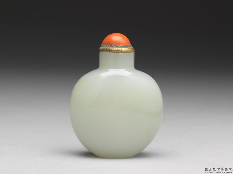 直口,削肩,壶身扁平形,平底,圈足内凹。带铜嵌珊瑚盖及牙匙。器身光素无纹。玉质温润,质地细密,展现简约质朴的风格。