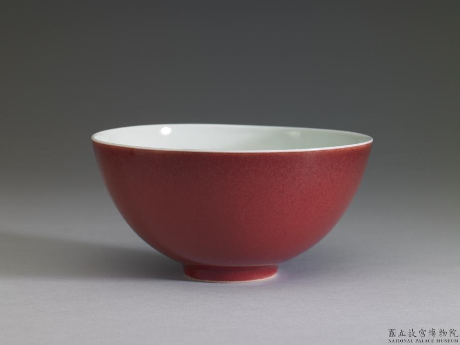 侈口大碗,深壁,平底,圈足。外壁罩铜红釉,釉色均匀。器内及外底施透明釉,圈足底缘露胎一圈。底书青花双圈「大清雍正年制」双行楷款。