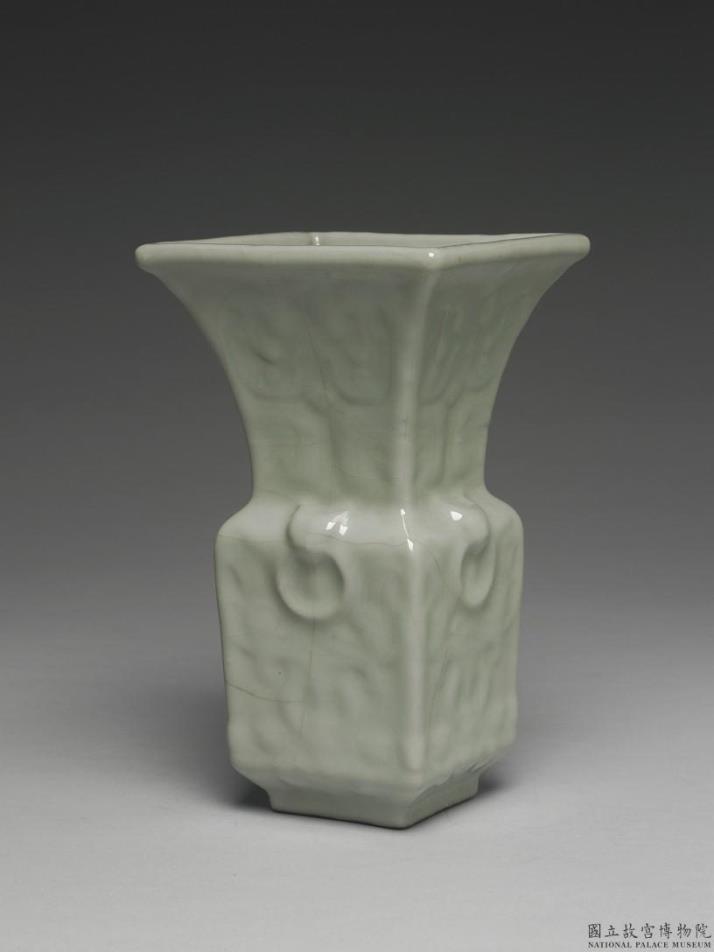 方形瓶,做大撇口,长方腹的方尊样,方形圈足。颈部模印对夔纹,肩部有兽首衔环纹,腹部饰兽首纹;全器施青釉,釉色润泽,有稀疏开片纹。足底涂护胎汁,呈铁黑色,底部中央有青花书「大清雍正年制」六字三行篆款。