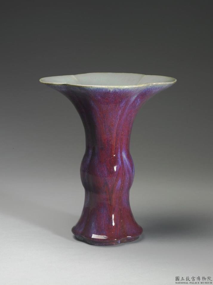 瓶,器仿青铜器觚形,海棠形,喇叭口,鼓腹,撇足。通体施炉钧釉,呈红、靛、天蓝、月白等多色深浅混杂流动窑变釉,器内作浅月白蓝色。器底施酱釉,底心印「大清乾隆年制」六字三行篆款,圈足露胎,施护胎汁,呈褐色。仿钧窑变釉为雍正时出现的新品种,系仿钧釉色繁衍而来,采多次施釉,烧成过程中,不同金属元素自然结合,产生流动的窑变釉色,一般偏红者,称「火焰红」。