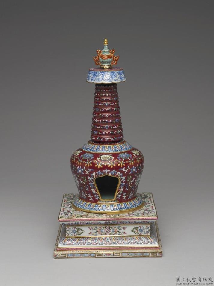 藏式塔,分段烧成后黏合。湖绿宝瓶顶,白地朵云纹宝盖;塔身为紫红地钩边彩绘番莲纹及朵花纹,并绘兽面与璎珞纹,龛门以卷叶纹框边,龛底饰莲瓣纹;须弥方座,饰白色地彩绘卷枝朵花纹,转折饰莲瓣纹,下缘仿绘如意云足;座足底露胎,涂护胎汁,底内凹施湖绿釉,中央有孔上方下圆,可见圆形湖绿釉塔底。