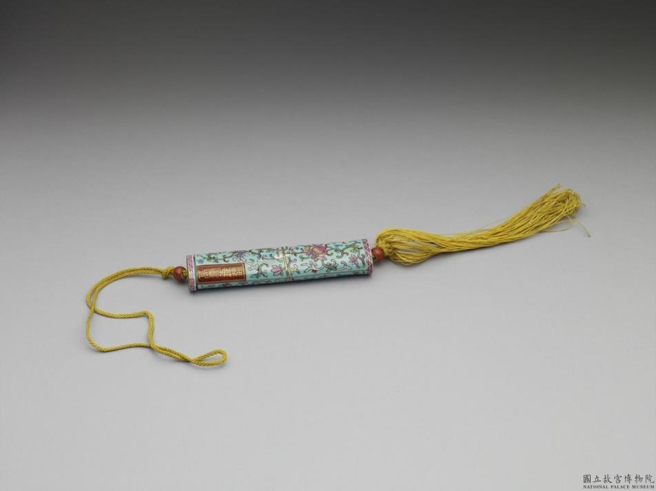 瓷牙签筒,筒作扁圆形,中空以装牙签,外壁以珐琅彩绘饰图样。一端可打开为器盖,盖上穿绳,接贯器底,出为丝穗。如此作法,便可固定、调整器盖的开阖。整器外型模仿已收束齐整之画卷,故器外壁中央绘有金线绕旋与牙白色别子,两端粉红色卷草一圈以示手卷之镶边。除此之外,外壁则以湖蓝地缠枝番莲为饰,有如一卷包首华丽的手卷。又左上有长方形红底金字榜题,作「万寿无疆」四篆字,或是为了祝寿而制作此器。