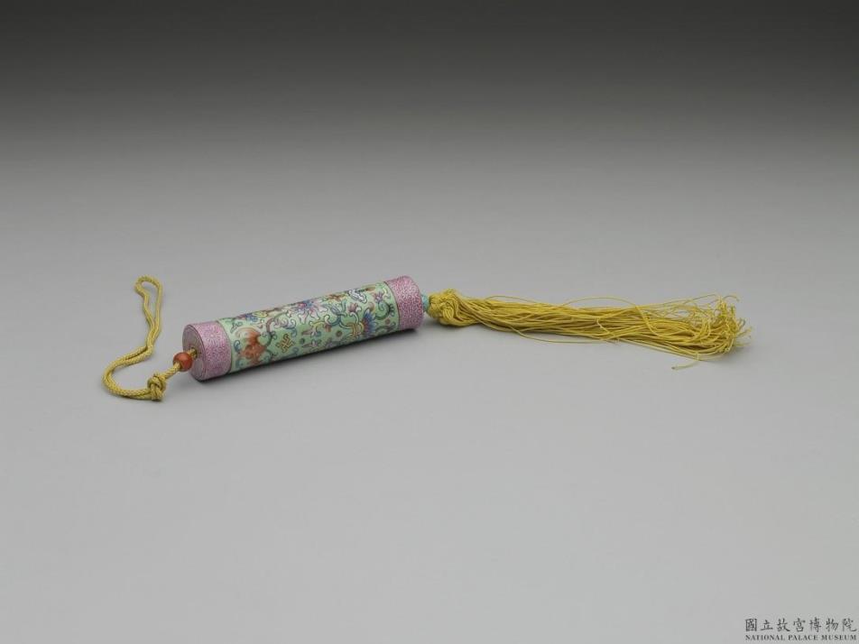 瓷牙签筒,作圆筒形,中空以装牙签,外壁以珐琅彩绘饰图样。一端可打开为器盖,盖上穿绳,接贯器底,出为丝穗。如此作法,便可固定、调整器盖的开阖。整器外型模仿已卷起之画卷,两端白地粉红色卷草花叶以示轴头,其花朵等距布列,隙地填饰卷草。除此之外,外壁绘湖蓝地缠枝番莲、蝙蝠为饰,蝙蝠张翅在上,头尾蔓出卷草,并与满覆器壁的缠枝番莲相接连,蝙蝠前方又饰有金彩「卍」字,其虽是模拟织绣繁丽的包首绫锦,但由装饰的蝙蝠、「卍」字看来,其装饰制作只藉手卷之形,而真意在表现吉祥意涵。