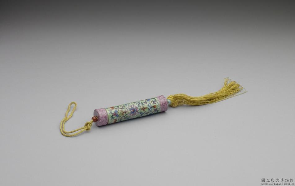 瓷牙签筒,作圆筒形,中空以装牙签,外壁以珐琅彩绘饰图样。一端可打开为器盖,盖上穿绳,接贯器底,出为丝穗。如此作法,便可固定、调整器盖的开阖。整器外型模仿已卷起之画卷,两端白地粉红色卷草花叶以示轴头,其花朵等距布列,隙地填饰卷草。除此之外,外壁绘湖蓝地缠枝番莲、蝙蝠为饰,蝙蝠张翅在上,头尾蔓出卷草,并与满覆器壁的缠枝番莲相接连,蝙蝠前方又饰有金彩「卍」字,其虽是模拟织绣繁丽的包首绫锦,但由装饰的蝙蝠、「卍」字看来,其装饰制作只藉手卷之形,而真意在表现吉祥意涵。