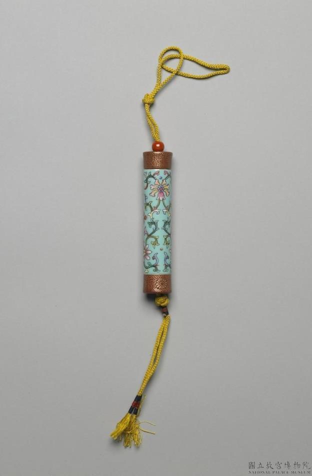 瓷牙签筒,作圆筒形,中空以装牙签,外壁以粉彩绘饰图样。上端为盖,具子口,盖上穿绳,接贯器底,出为丝穗。上端吊以一红色瓷珠,下端吊以一绳结。如此作法,便可固定、调整器盖的开阖。外壁为湖蓝地缠枝图案式花卉,器身下缘与盖壁对称,同为红地银彩花卉锦,盖顶面与器底面同为宝相花卉瓣,器底作浅蓝色。