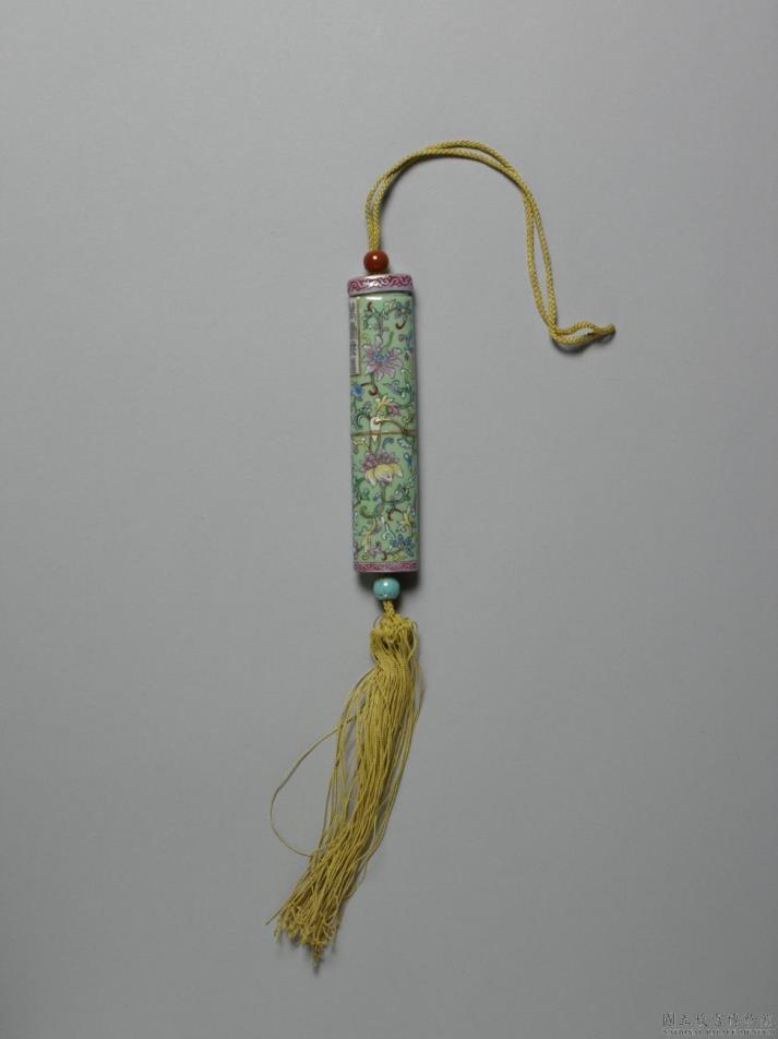 瓷牙签筒,筒作扁圆形,中空以装牙签。外壁以珐琅彩绘纹样。一端可打开为器盖,盖上穿绳,通贯器底,出为丝穗。两端各系一瓷珠,透过瓷珠上下的移动,可调整器盖的开阖。整器外型模仿已收束齐整之画卷,故器外壁中央绘有金线绕旋与牙白色别子,两端粉红色卷草一圈以示手卷之镶边。除此之外,外壁则以浅绿地缠枝番莲为饰,有如一卷包首华丽的手卷。又左上有长方形金框榜题,作黑色「万寿无疆」四篆字,或是为了祝寿而制作此器。