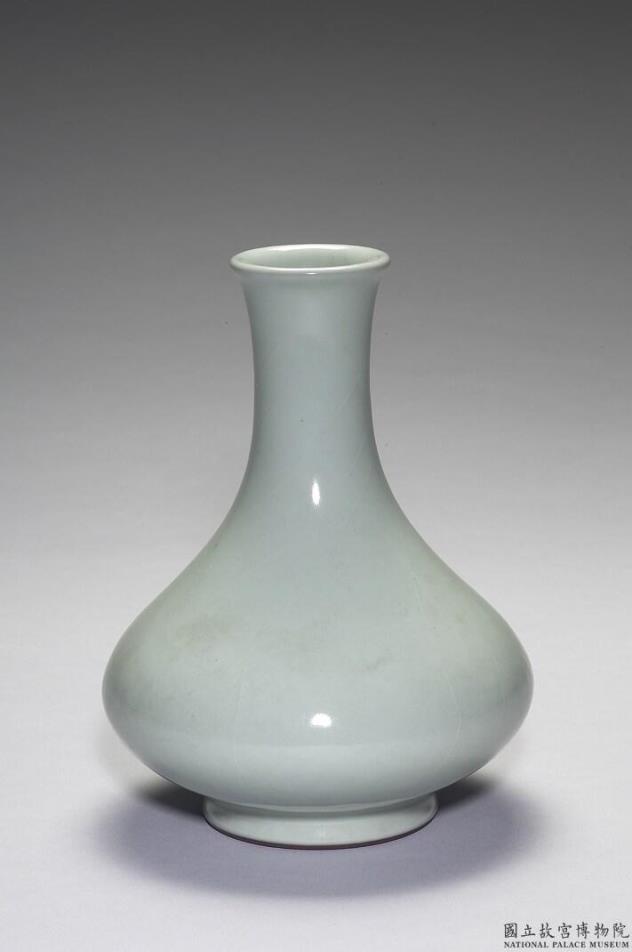 直口,长颈,溜肩,扁圆广腹,矮圈足。全器施冬青釉,釉面微见浅色开片纹。足缘呈深褐色,底书「大清乾隆年制」青花六字三行篆书款。